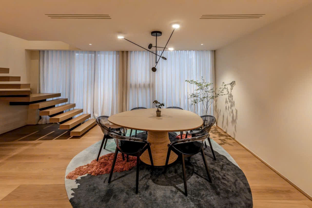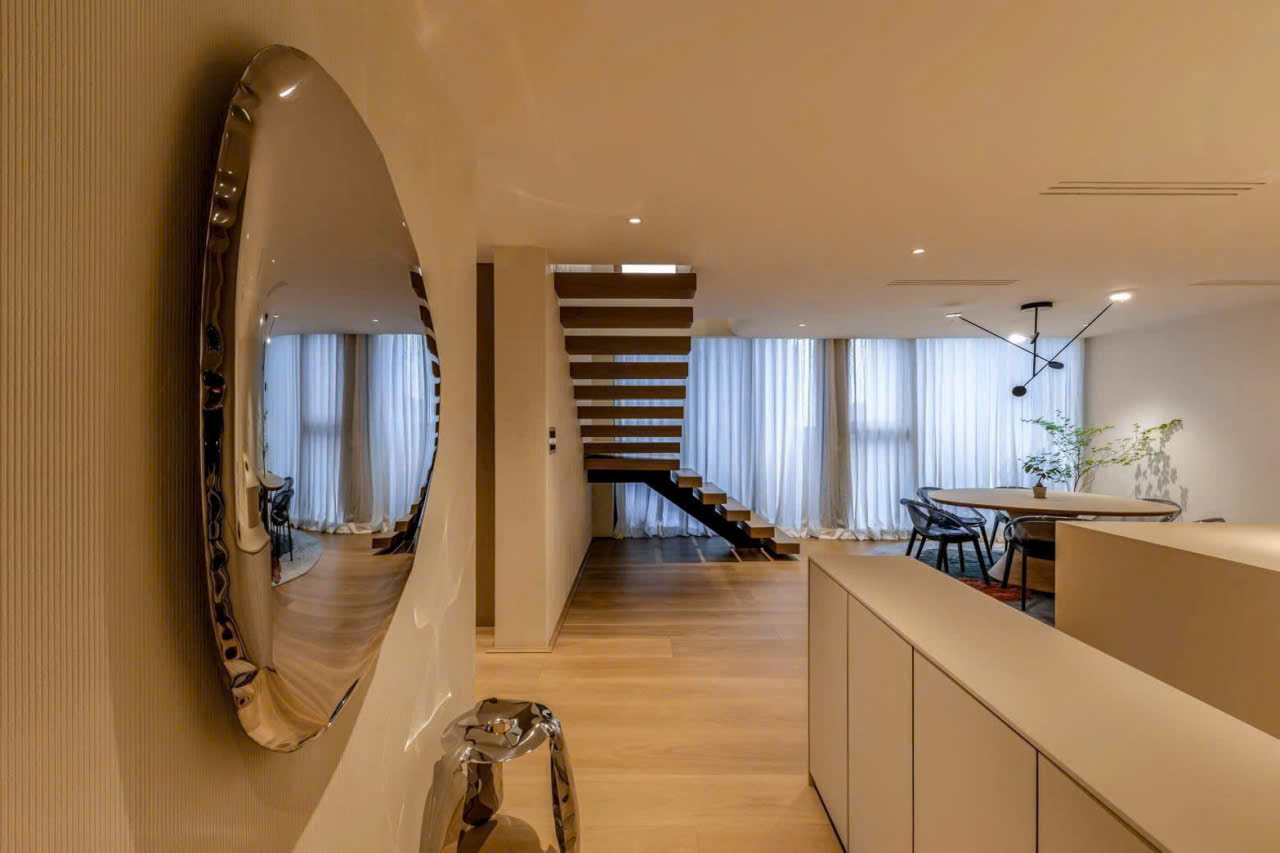 Không gian phòng khách nổi bật với thiết kế thông tầng, kết hợp hệ cửa kính cao kịch trần giúp đón trọn ánh sáng tự nhiên và mở ra tầm nhìn panorama tuyệt đẹp về thành phố và sông Sài Gòn. Đây chính là điểm nhấn tạo nên giá trị độc bản cho căn hộ.