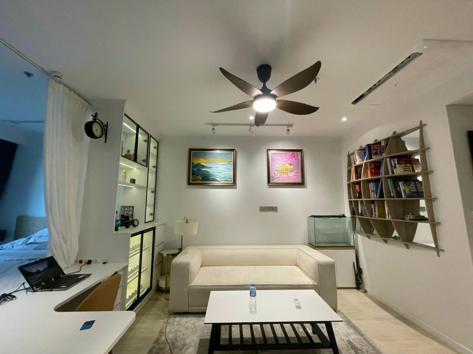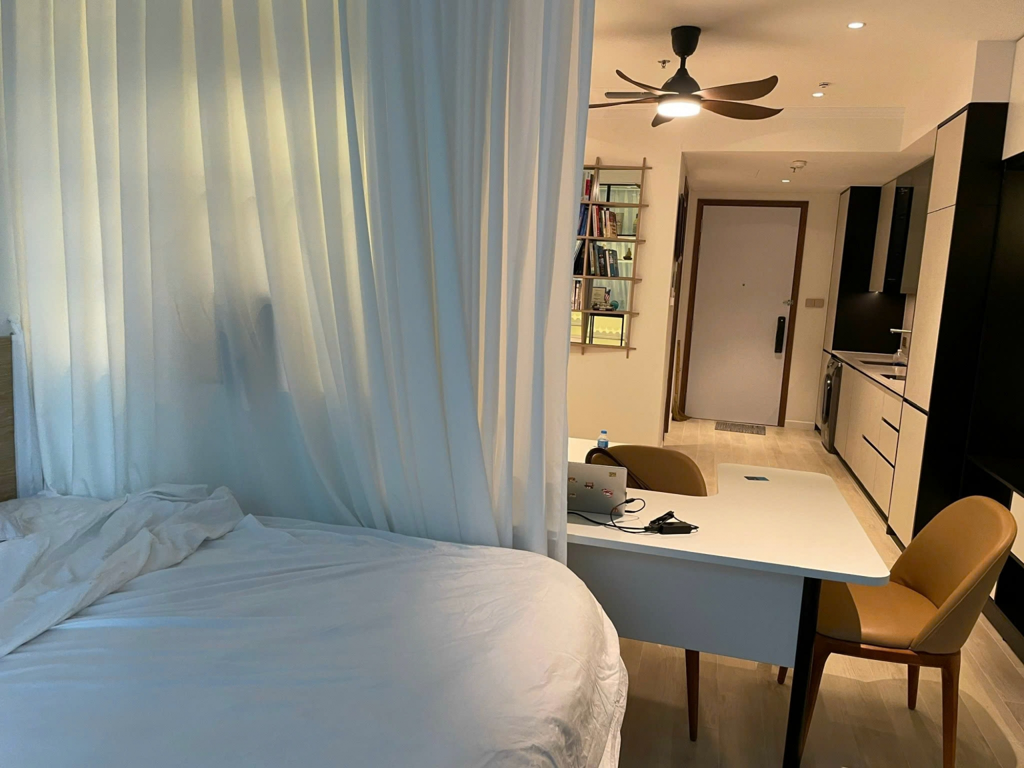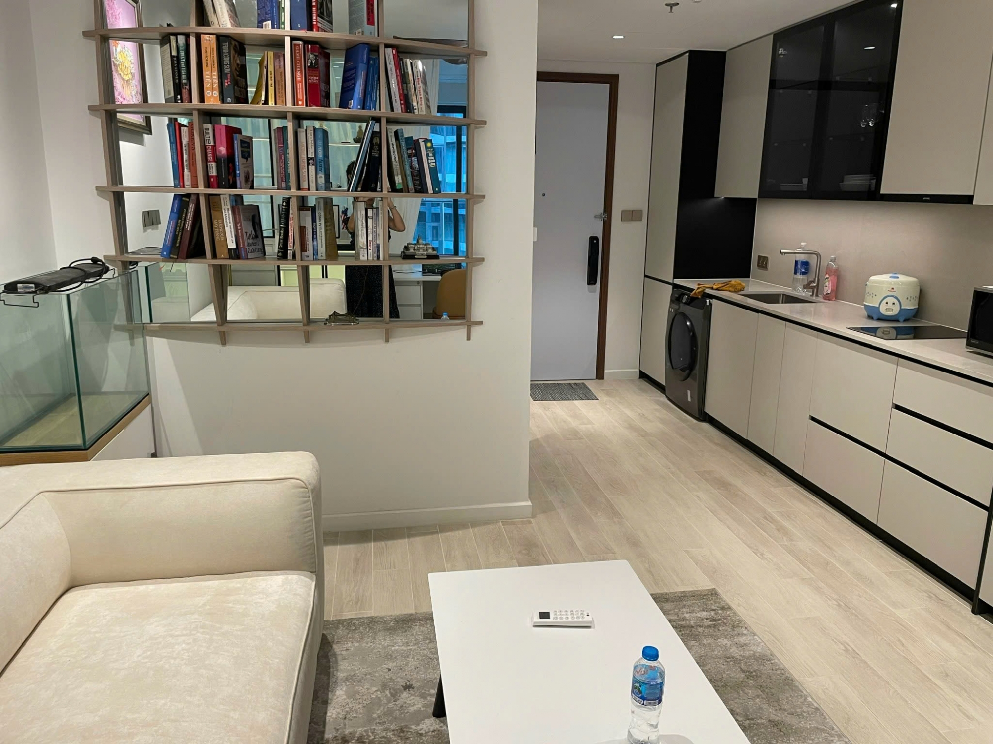 Căn studio có không gian mở thông minh, bố trí hợp lý giữa khu vực tiếp khách, làm việc, nghỉ ngơi và bếp, mang lại cảm giác rộng rãi và sang trọng. Toàn bộ nội thất được trang bị đầy đủ và đồng bộ, sử dụng vật liệu cao cấp, thiết kế tinh xảo, chỉ cần xách vali vào ở ngay.