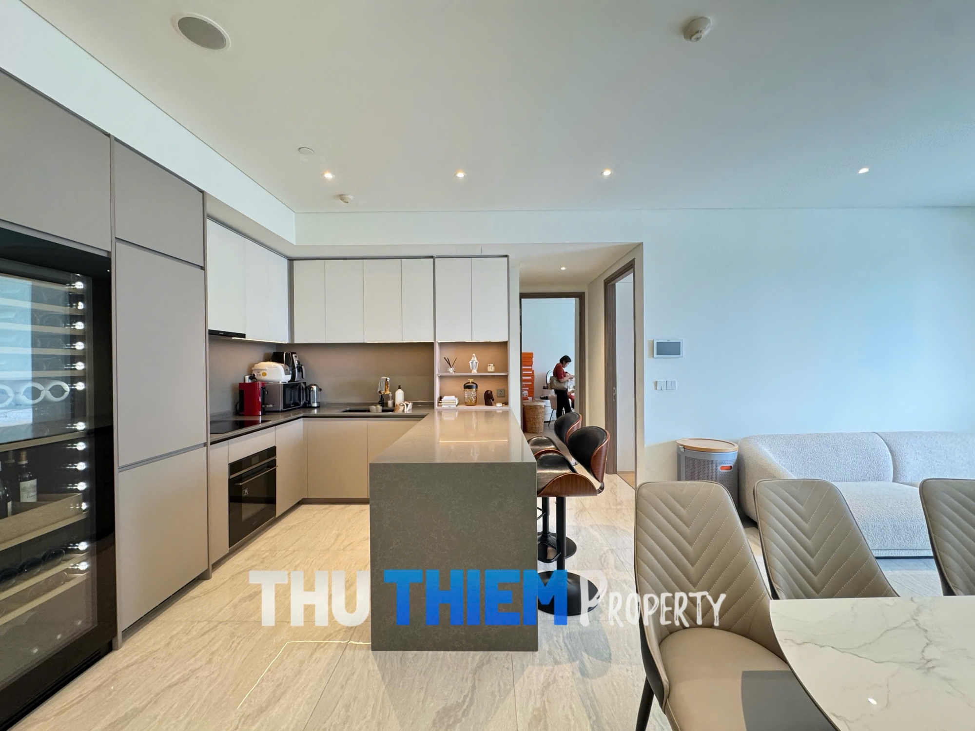 Không gian phòng khách rộng, trần cao, kết nối trực tiếp khu bếp và bàn ăn, tạo cảm giác sang trọng nhưng vẫn ấm cúng. Phòng ngủ yên tĩnh, cửa kính lớn đón gió và ánh sáng, mang lại trải nghiệm sống thoải mái giữa trung tâm thành phố.