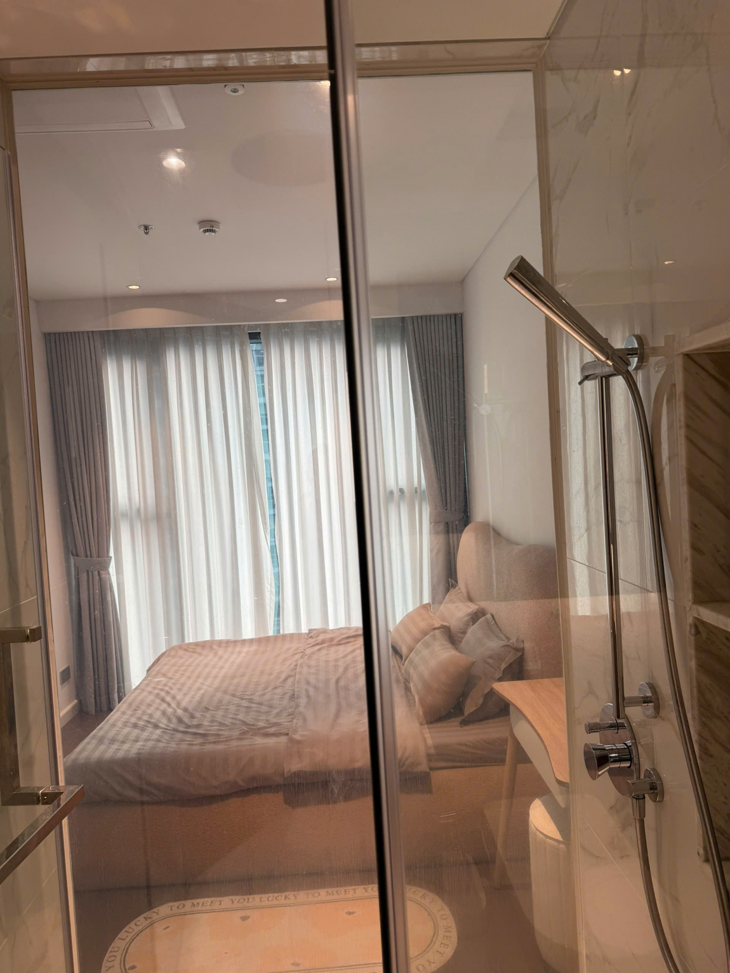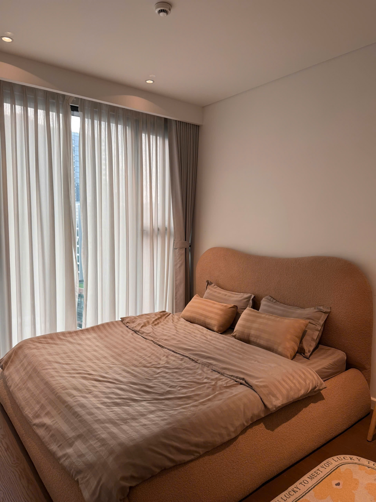 Căn hộ được thiết kế hiện đại với bố cục hợp lý gồm 2 phòng ngủ và 2 phòng vệ sinh, mang đến không gian sống tiện nghi và thoải mái cho gia đình nhỏ hoặc chuyên gia nước ngoài. Phòng khách rộng rãi, kết nối trực tiếp với ban công kính lớn, đón ánh sáng tự nhiên và gió trời, tạo cảm giác thông thoáng và dễ chịu.