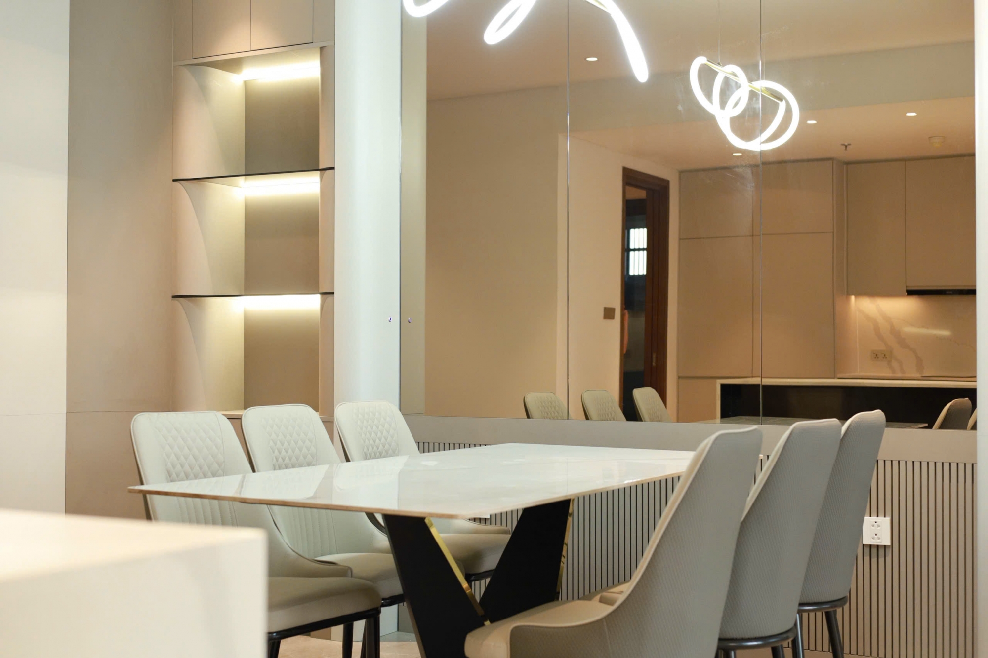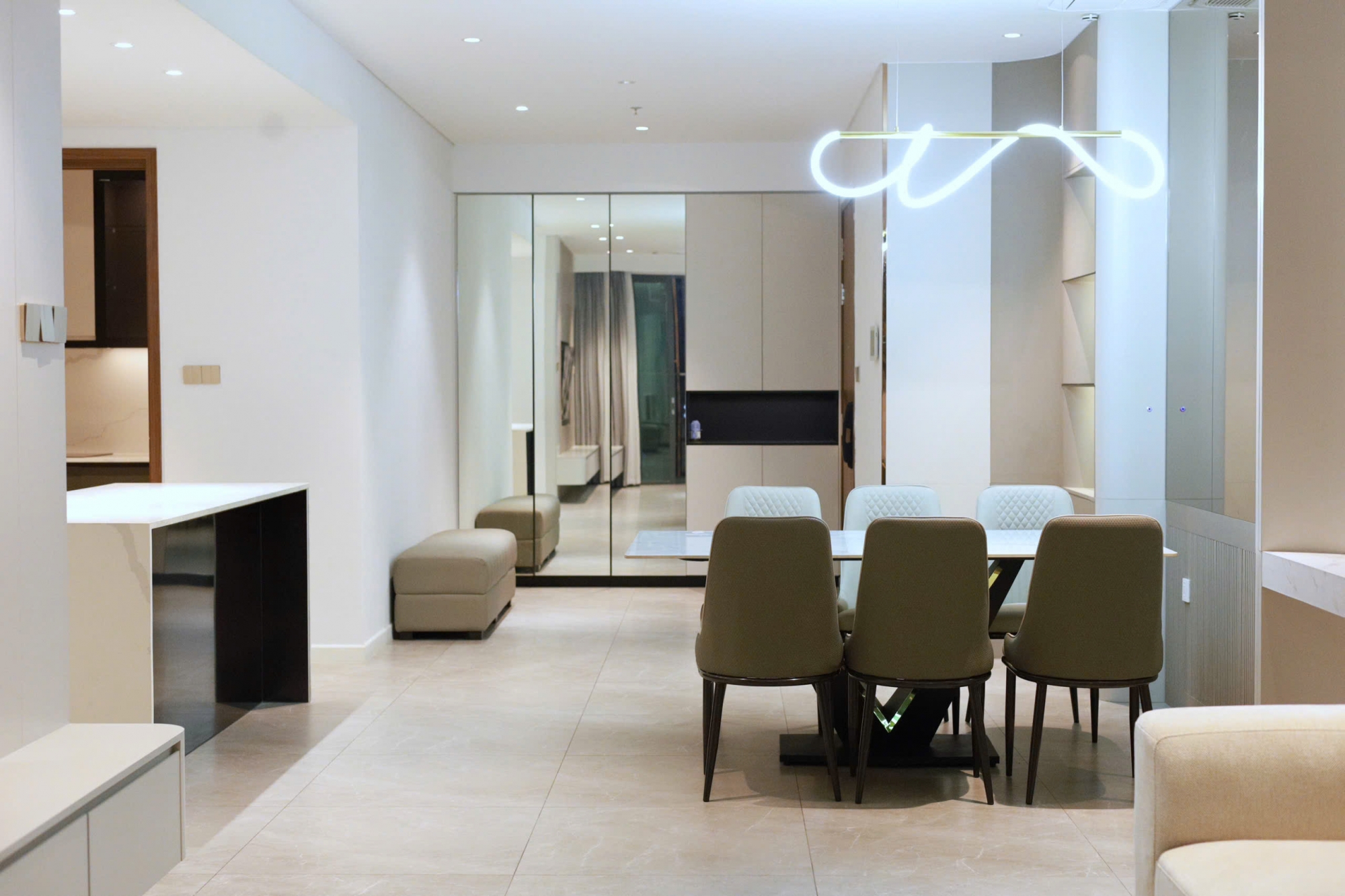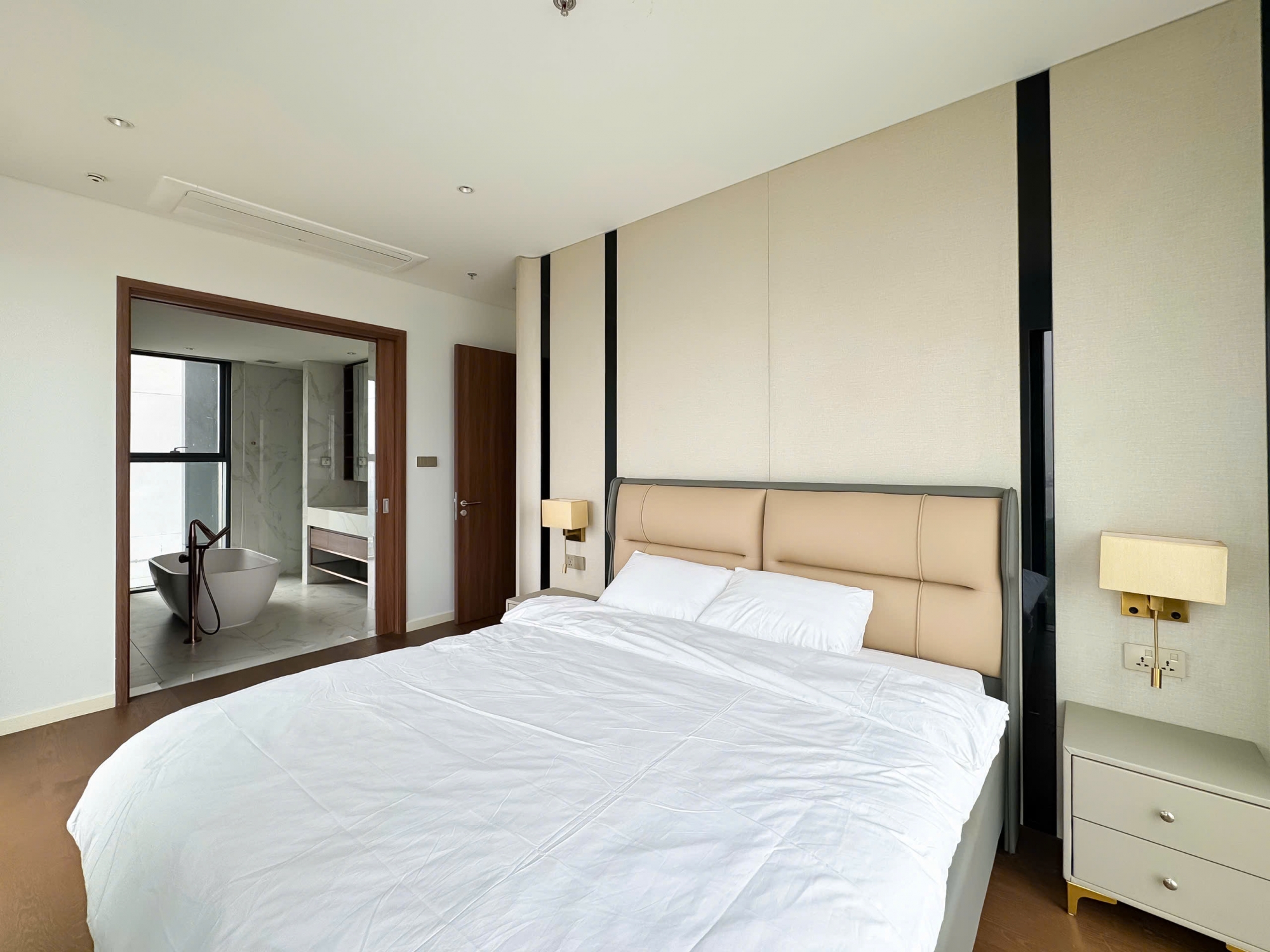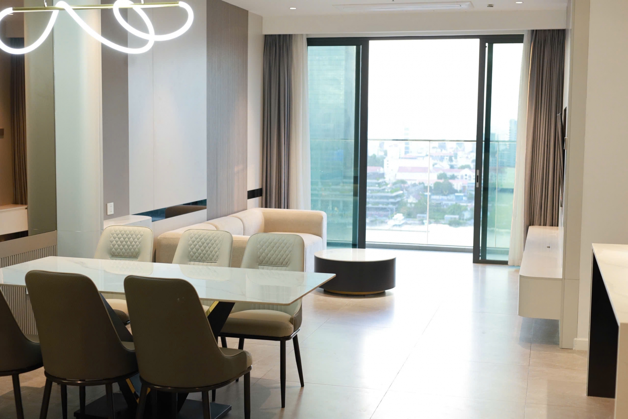 Nội thất trong căn hộ được trang bị đầy đủ và cao cấp, thiết kế đồng bộ theo phong cách hiện đại, sử dụng vật liệu chất lượng và tinh tế trong từng chi tiết. Không gian sống lý tưởng cho gia đình, chuyên gia nước ngoài hoặc những khách hàng đang tìm kiếm nơi ở sang trọng ngay trung tâm mới của thành phố.