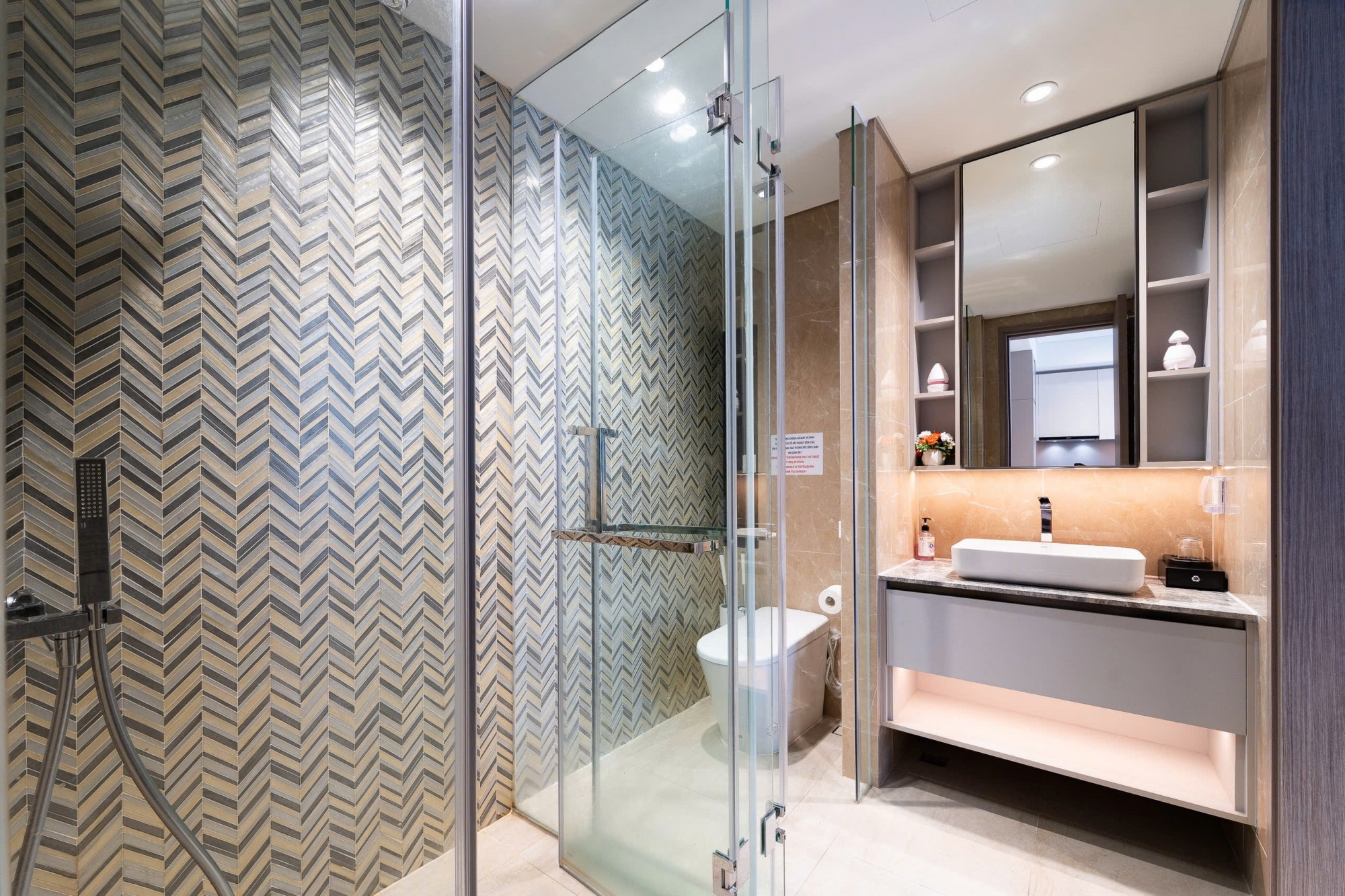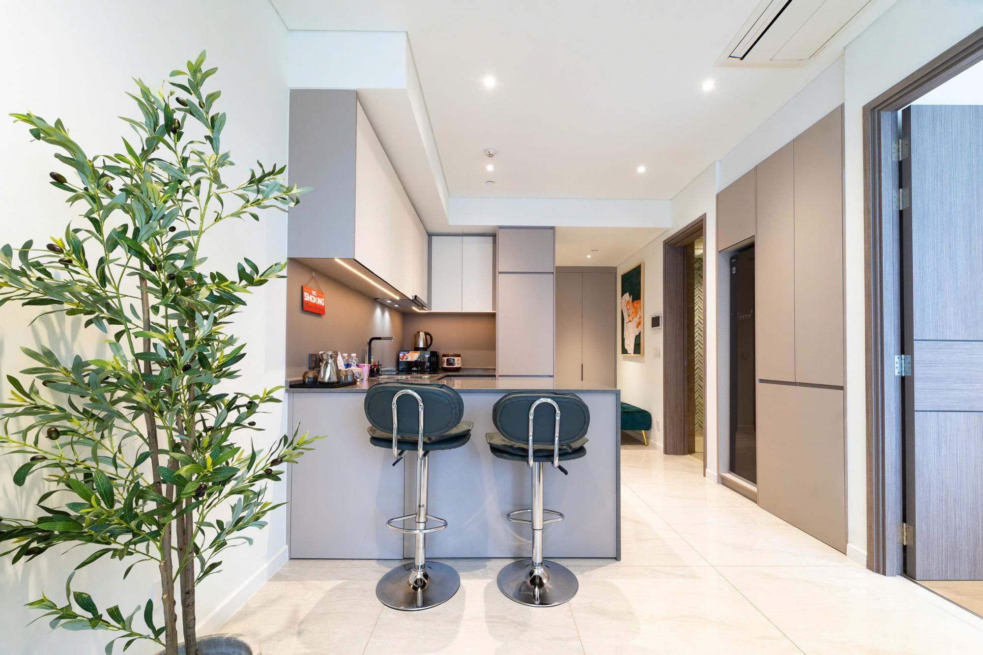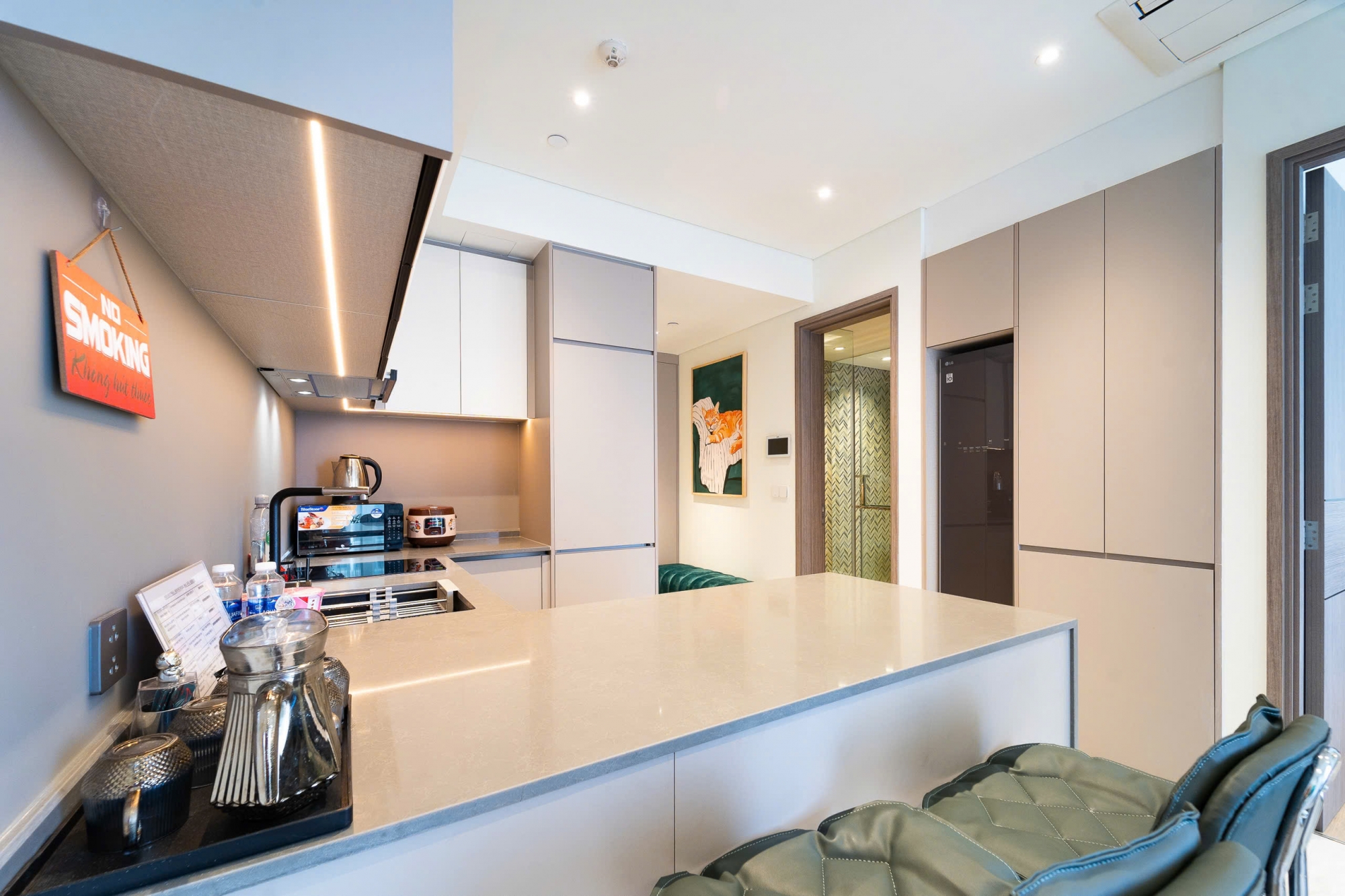 Căn hộ thuộc phân khu The Opera của The Metropole Thủ Thiêm được thiết kế hiện đại với không gian sống tinh tế và tiện nghi Phòng khách bố trí gọn gàng với sofa êm ái kết hợp tông màu sáng mang lại cảm giác ấm cúng và sang trọng