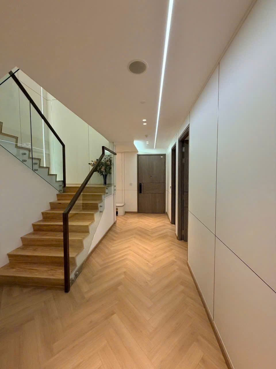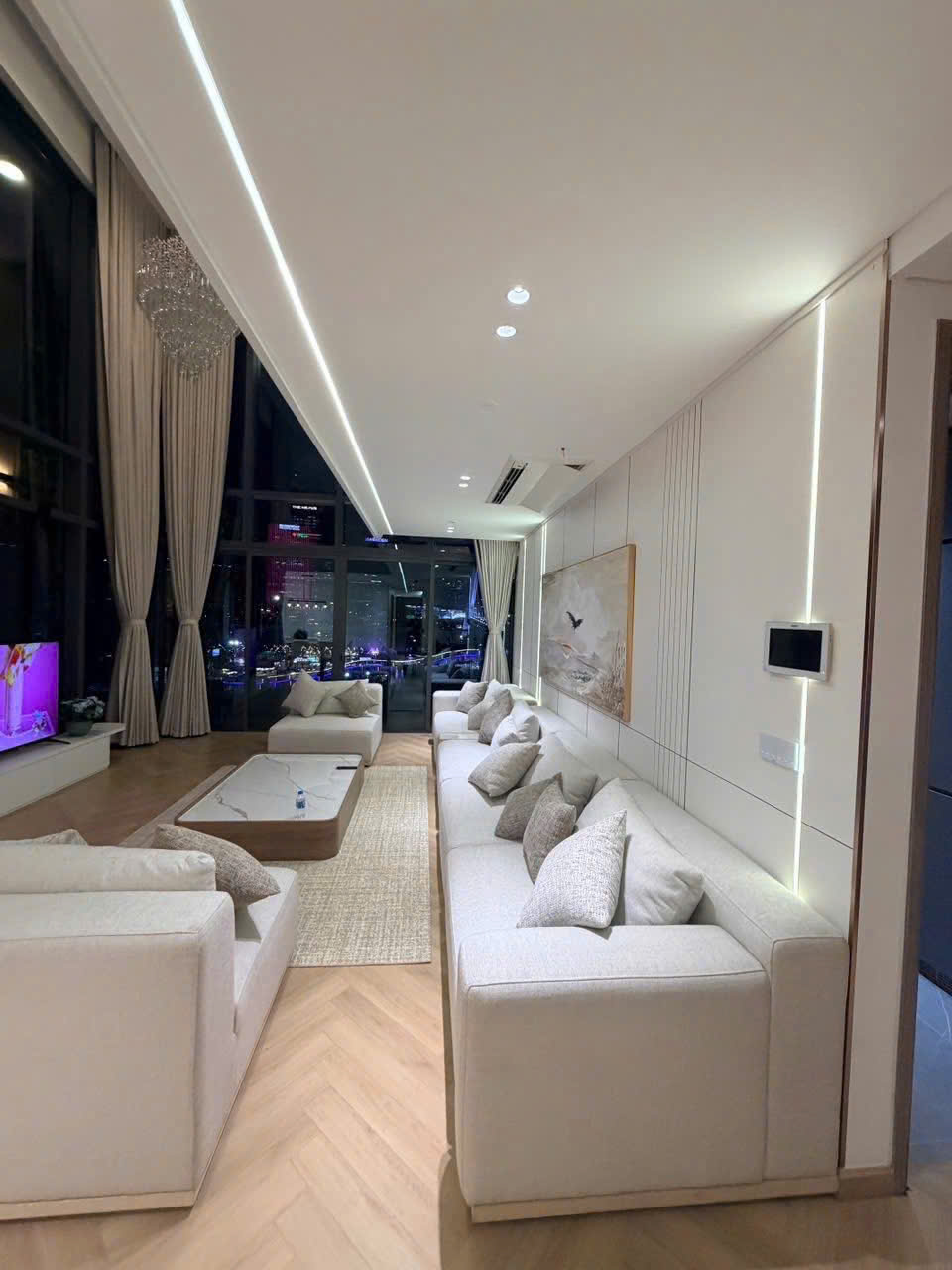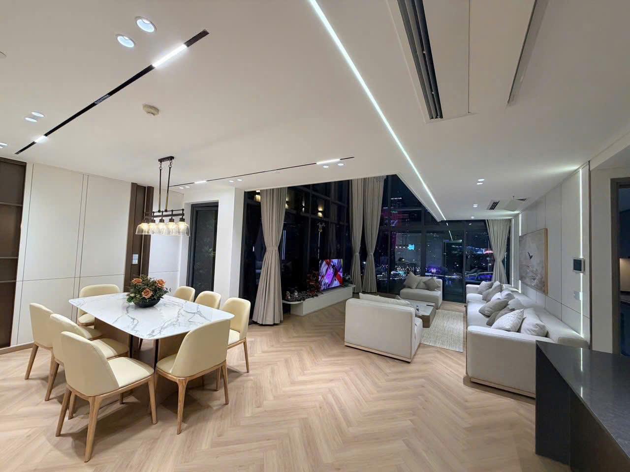 Căn hộ có diện tích 232m², thiết kế duplex 2 tầng, gồm 4 phòng ngủ rộng rãi. Không gian phòng khách nổi bật với trần cao, kết hợp hệ kính lớn từ sàn đến trần giúp tối ưu ánh sáng tự nhiên và mở rộng tầm nhìn.
