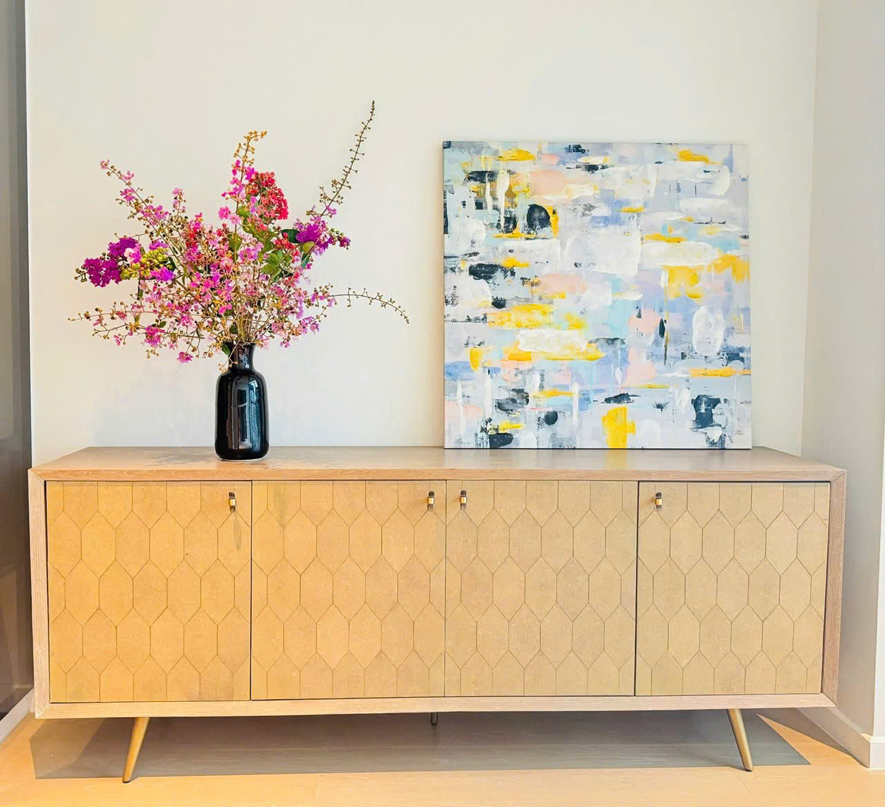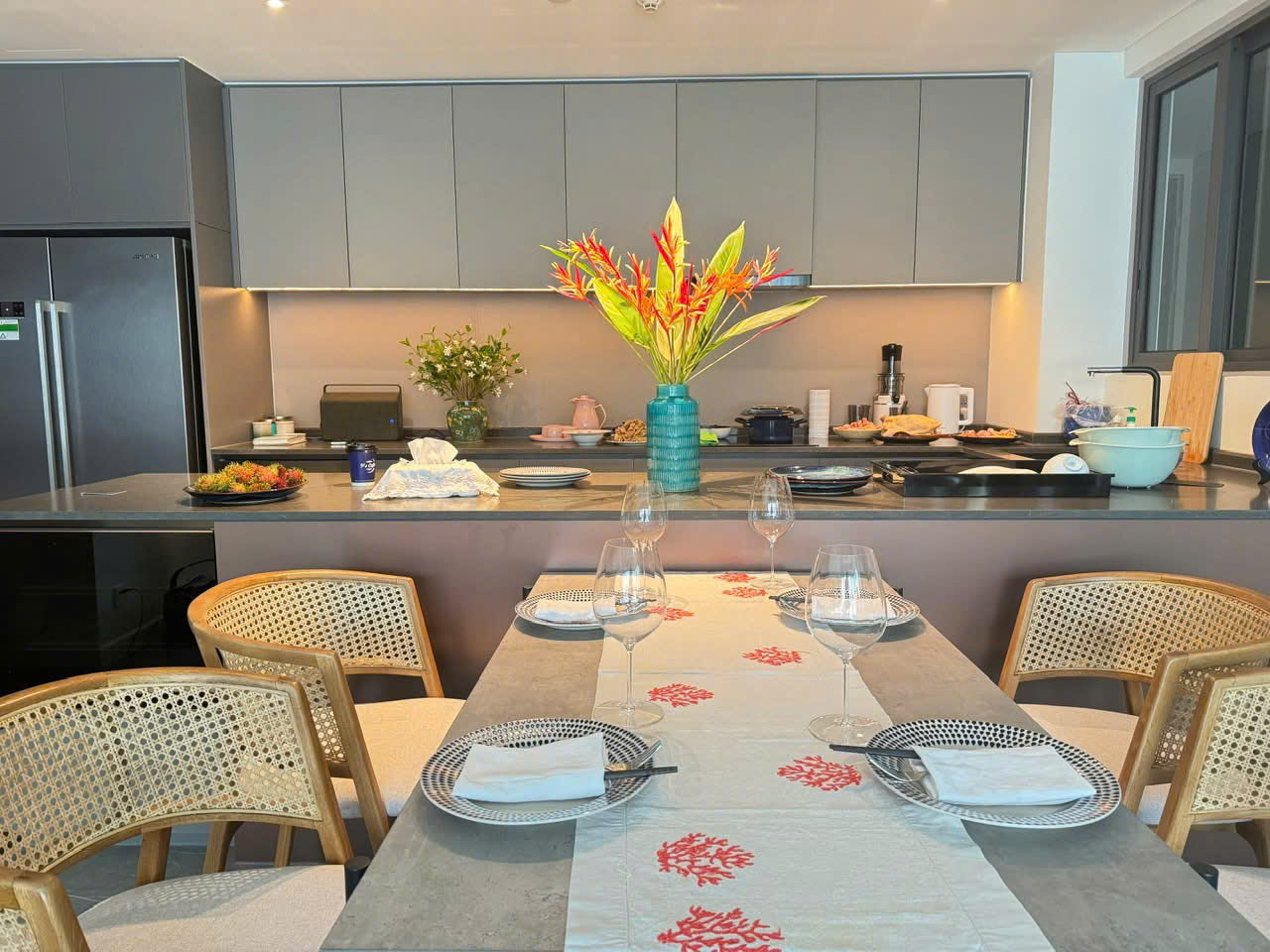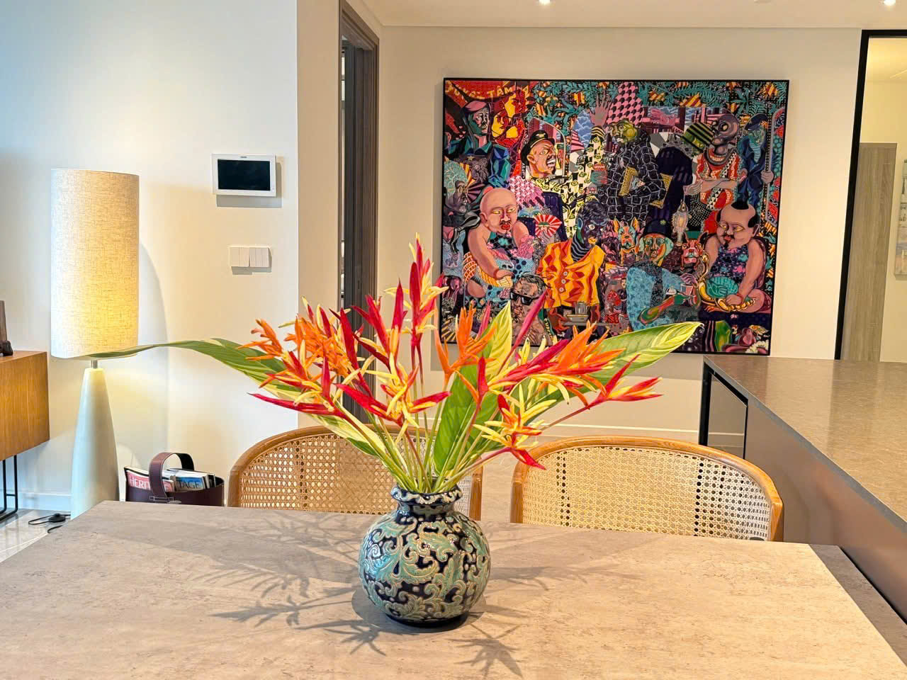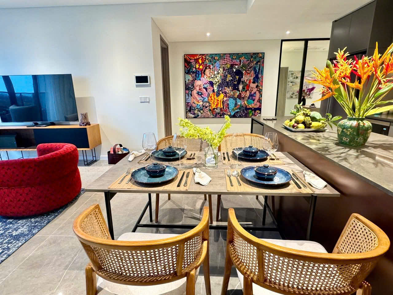 The apartment features a modern layout with a spacious living room, open kitchen, and large balcony that allows plenty of natural light. It comes fully furnished with carefully selected high-end furniture in elegant, neutral tones, creating a warm and sophisticated living atmosphere.