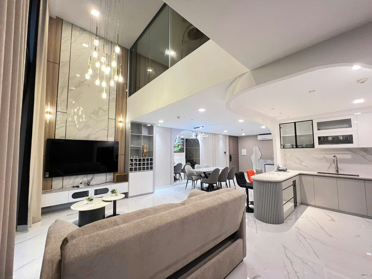 Không gian phòng khách thiết kế mở, kết nối trực tiếp với khu bếp, tạo nên tổng thể hài hòa và hiện đại. Toàn bộ căn hộ được trang bị full nội thất cao cấp, đầy đủ tiện nghi, mang lại trải nghiệm sống tiện lợi và sang trọng.